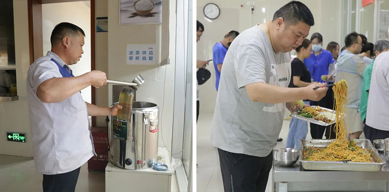 食堂還為所有職工貼心準備了消暑解渴的免費涼茶,配方有金銀花、菊花、蒲公英、甘草等,既能防暑,又有清熱化濕、提神醒腦等功效。清爽開胃的涼面,拌一拌,食欲滿滿。
