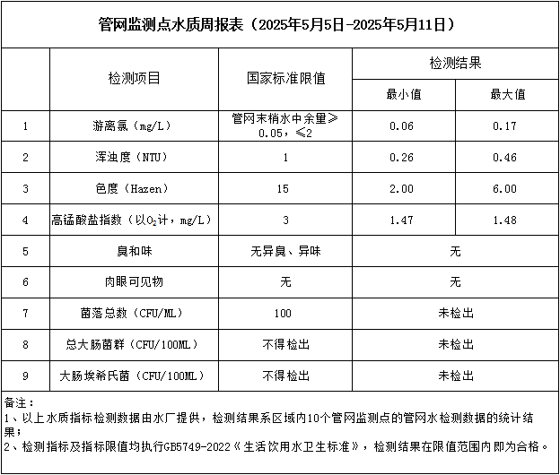 管網監測點水質周報表(2025年5月5日-2025年5月11日)