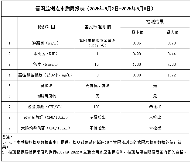 管網(wǎng)監(jiān)測(cè)點(diǎn)水質(zhì)周報(bào)表(2025年6月2日-2025年6月8日)