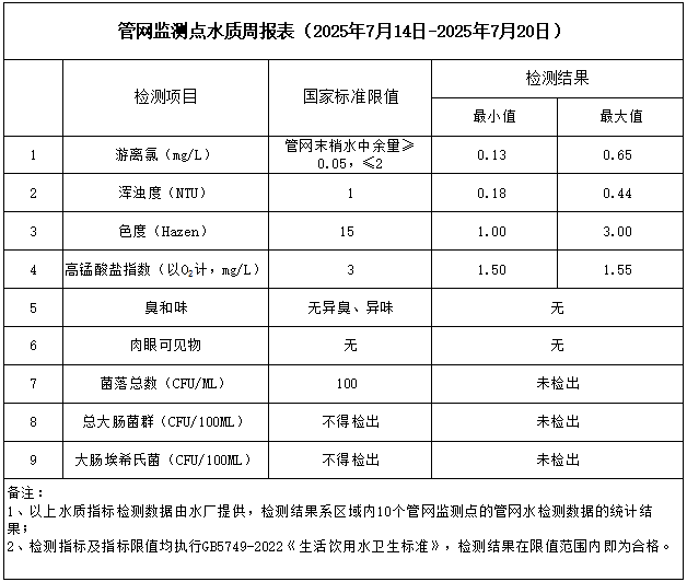 管網(wǎng)監(jiān)測(cè)點(diǎn)水質(zhì)周報(bào)表(2025年7月14日-2025年7月20日)