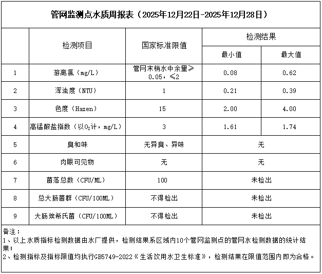 管網(wǎng)監(jiān)測點水質(zhì)周報表(2025年12月22日-2025年12月28日)