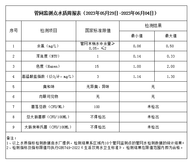管網監測點水質周報表(2023年05月29日-2023年06月04日)