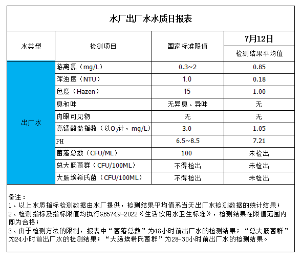 水廠出廠水水質(zhì)日報表(2023-7-12)