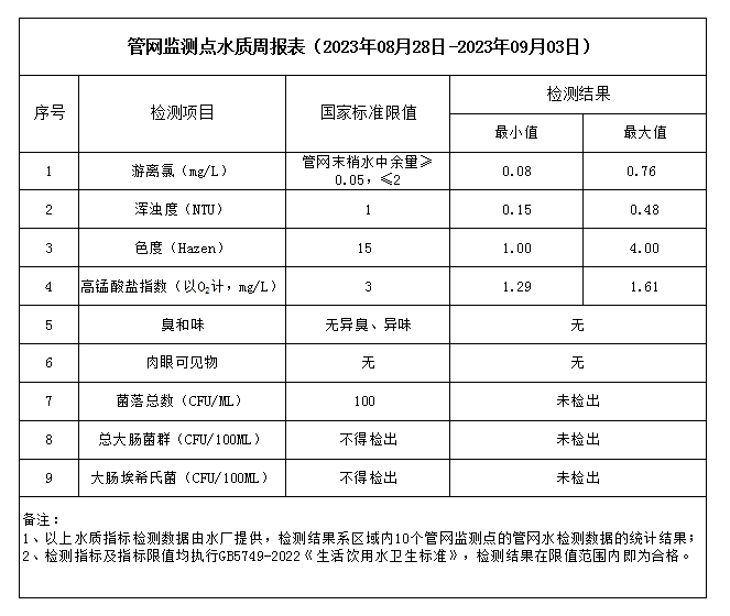 管網(wǎng)監(jiān)測點(diǎn)水質(zhì)周報表(2023年08月28日-2023年09月03日)
