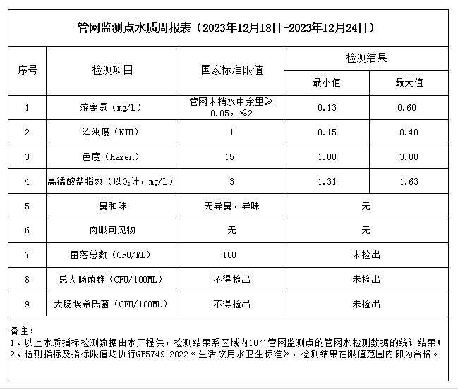 管網(wǎng)監(jiān)測點(diǎn)水質(zhì)周報(bào)表(2023年12月18日-2023年12月24日)