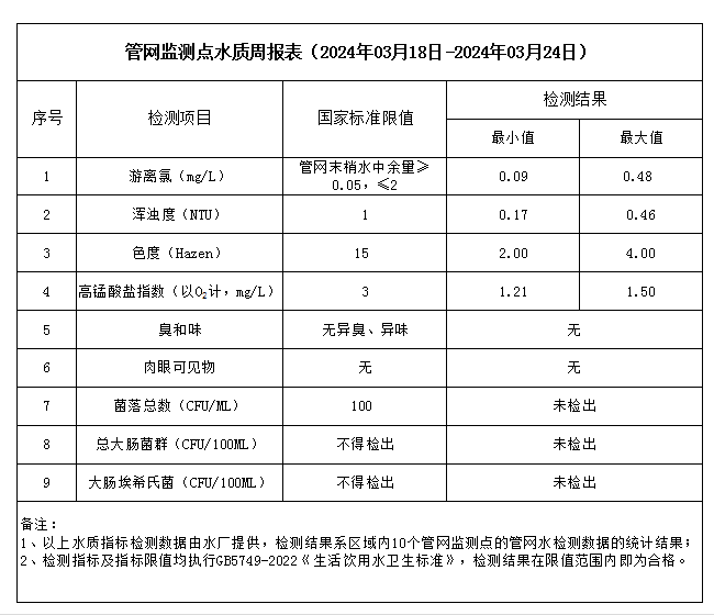 管網監測點水質周報表(2024年03月18日-2024年03月24日)